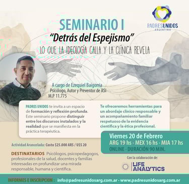 Con la colaboración de Life Analytics, este seminario, a cargo del Psicólogo Ezequiel Baigoria (Autor y Preventor de ASI, M.P. 11.775), propone distinguir entre los discursos instalados y la realidad que se manifiesta en la práctica terapéutica, poniendo en el centro a la persona, su historia y su sufrimiento concreto. Nos detendremos en interrogantes que hoy son urgentes: